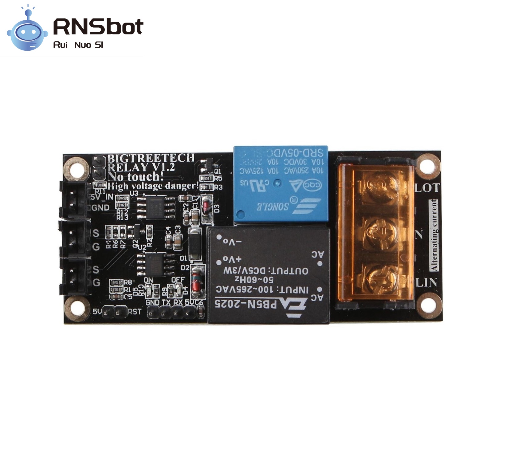 This is a BIGTREETECH Relay V1.2 Automatic Shutdown Module. BIGTREETECH Relay V1.2 is an upgrade of the original (BIGTREETECH V1.0). After upgrading, a small MCU was added on the module to make the module more controllable and stable. Besides , we have also increased short circuit detection circuit. After connecting the 5V and GND on the motherboard to the module, if there is a 5V short circuit, the module will immediately power off to prevent damage on the motherboard and the risk of fire caused by short circuit.